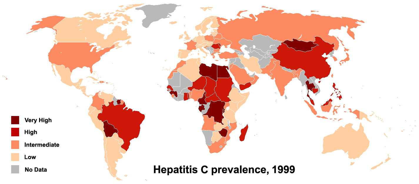 La transmisión ocurre por agua contaminada o alimentos contaminados y en algunos países puede ser importada cuando se viaja a zonas de alto riesgo. La vacuna contra la hepatitis A es actualmente la mejor protección contra la enfermedad. En el siguiente mapa se observa la prevalencia de la hepatitis tipo A la cual, como vemos es alta sobre todo en países de nivel medio a bajo, todo el continente africano, sureste asíatico así como medio oriente y Latinoamérica, esto es debido a la falta de información en la mayoría de esos países: